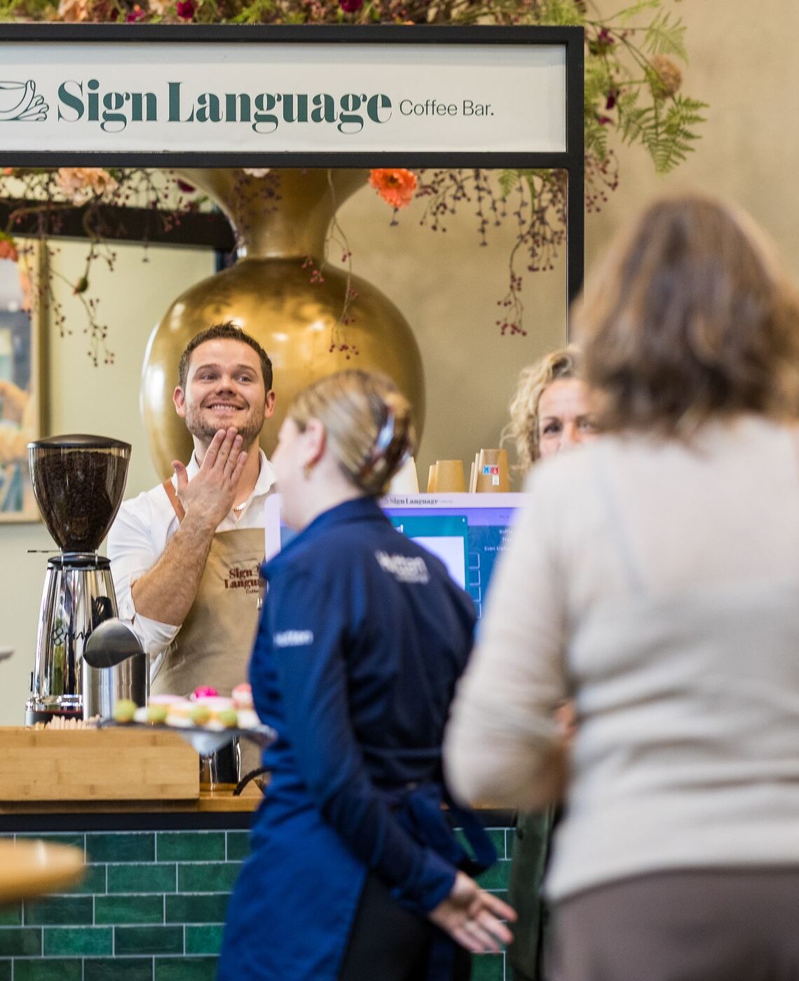 Een ware koffiebeleving is meer dan alleen goede koffie, vinden wij! Onze Gebaarista’s maken daarin écht het verschil. Bij Sign Language Coffee Bar bestel je al gebarend je bestelling met behulp van het menu op een videoscherm. Onze slechthorende of dove barista bereidt daarna met veel passie jouw bestelling. Precies zoals jij je koffie lekker vindt. Zo geniet je van je koffiemoment, leer je iets nieuws en leg je op een andere manier contact met mensen. Slechts een heel klein deel van de inwoners van Nederland beheerst gebarentaal. Zonde!